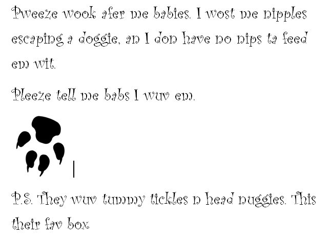 On the brighter side, a litter of kittens has been discovered sheltering inside a cardboard box at the rear of Durango’s Delicatessen on Leaf Street. Mr and Mrs Durango found the litter around 5-am this morning with a note taped to the box.